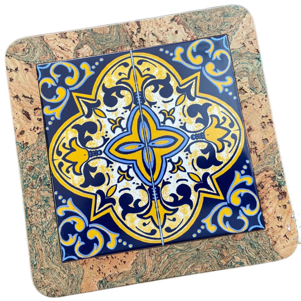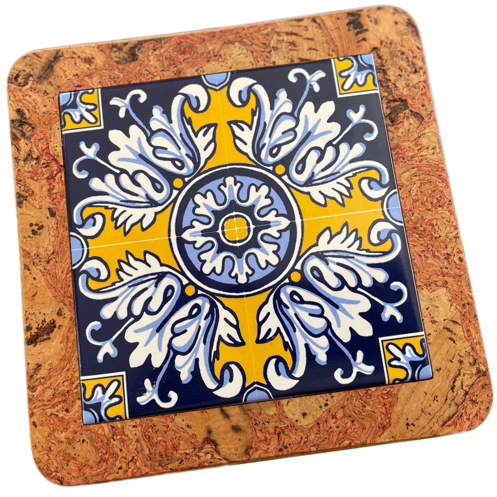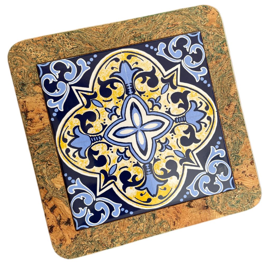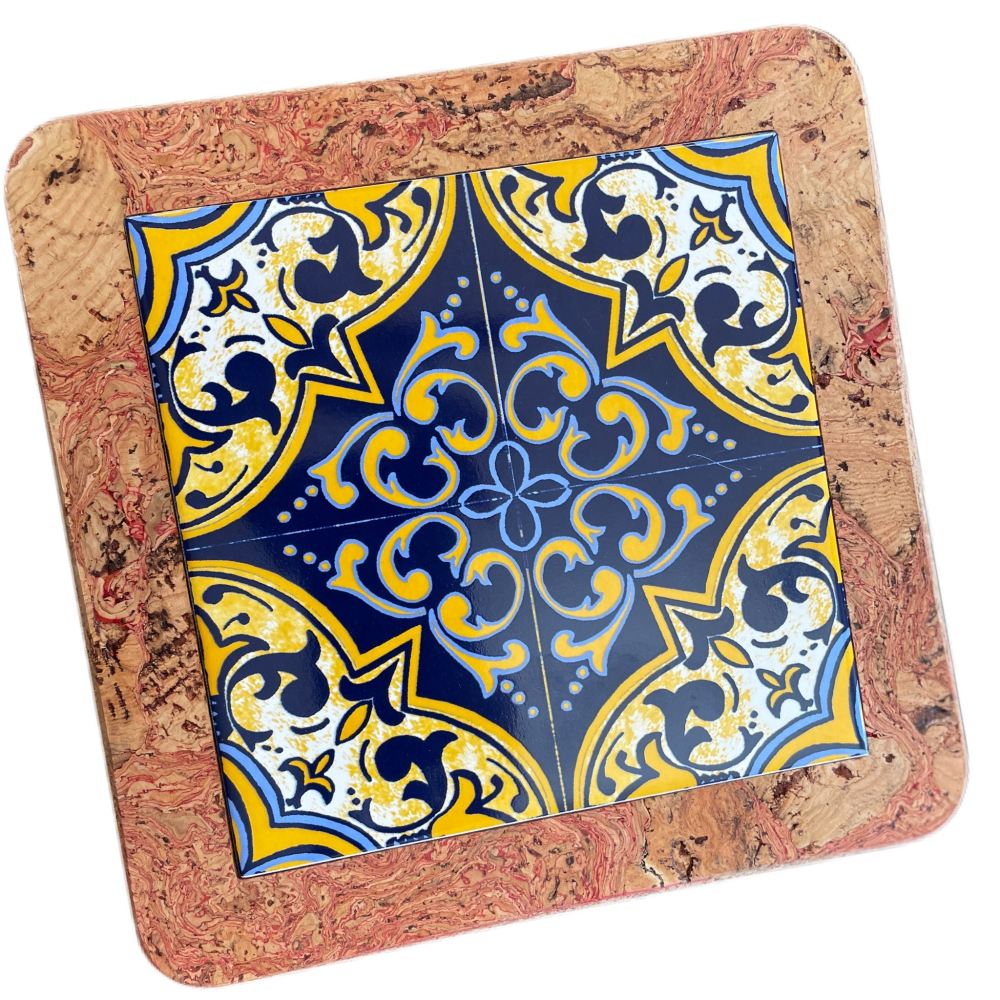 Untersetzer aus wild gefärbtem Kork. Mit einer typisch portugiesischen Fliese - der Azulejo - in der Mitte.