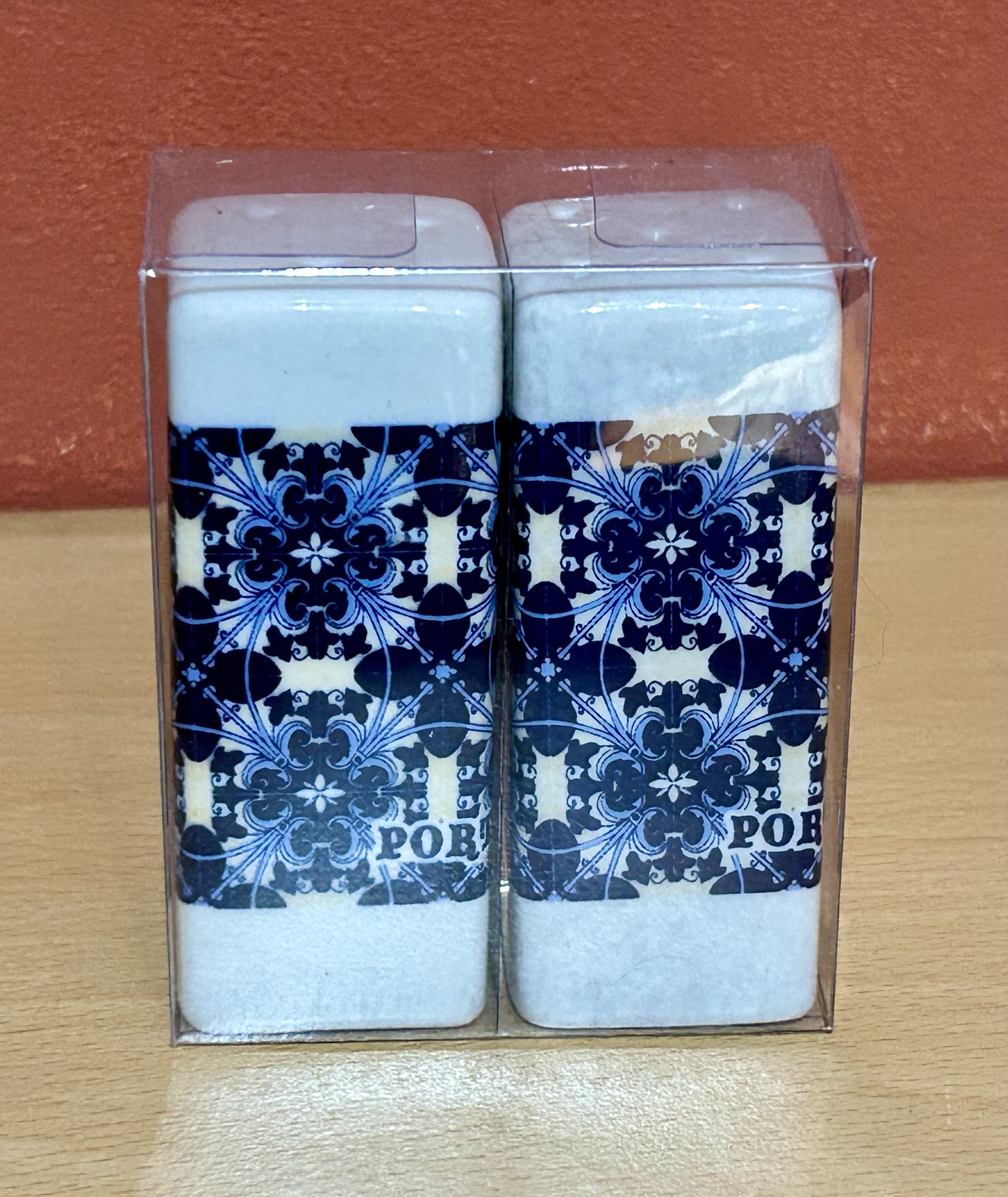 Ein fröhliches buntes Salz- und Pfefferstreuer-Set mit Azulejo-Muster