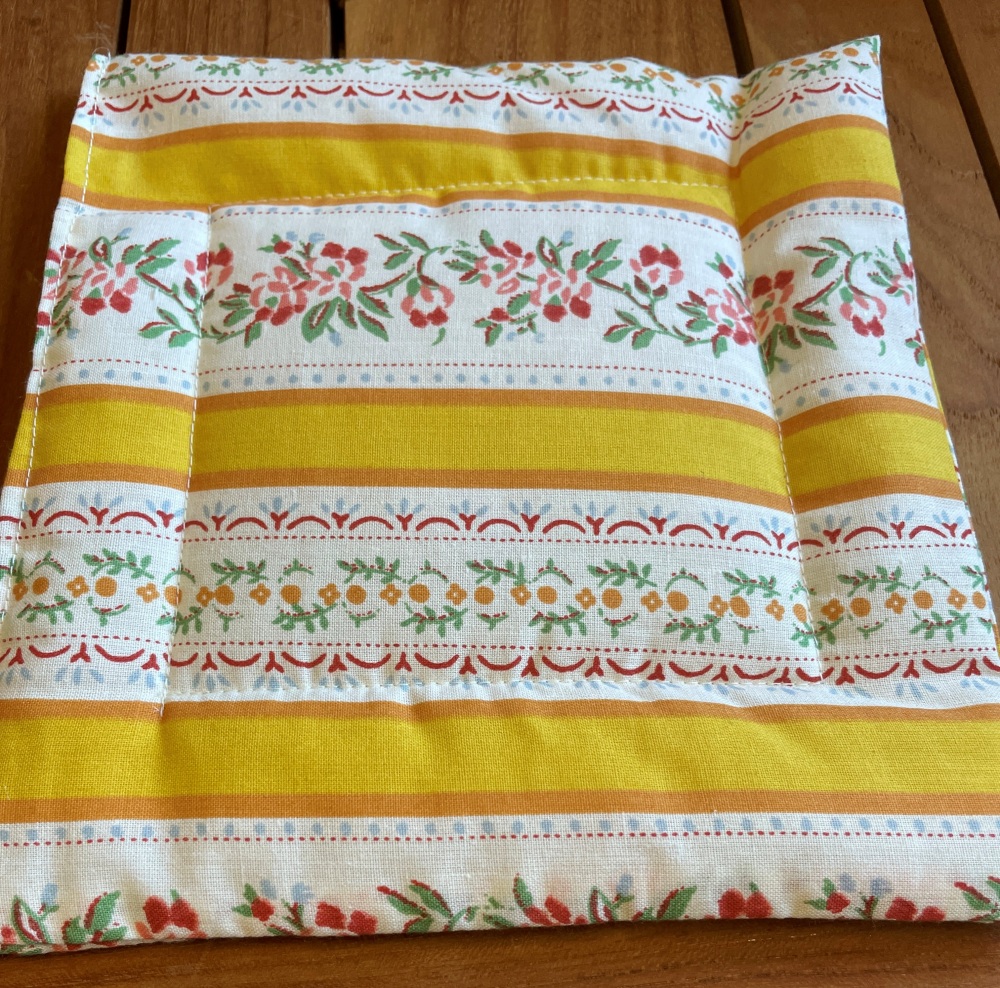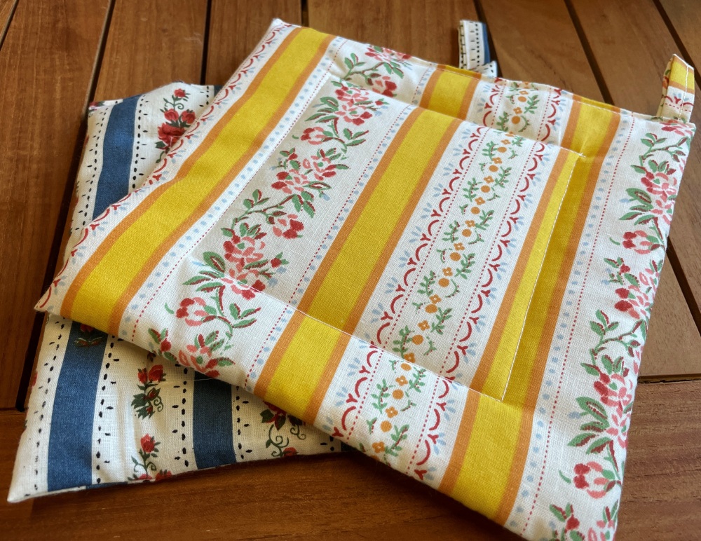 Wunderschöne, in Handarbeit gefertigte Topflappen. Sie kommen im Zweierset (beide gelb).