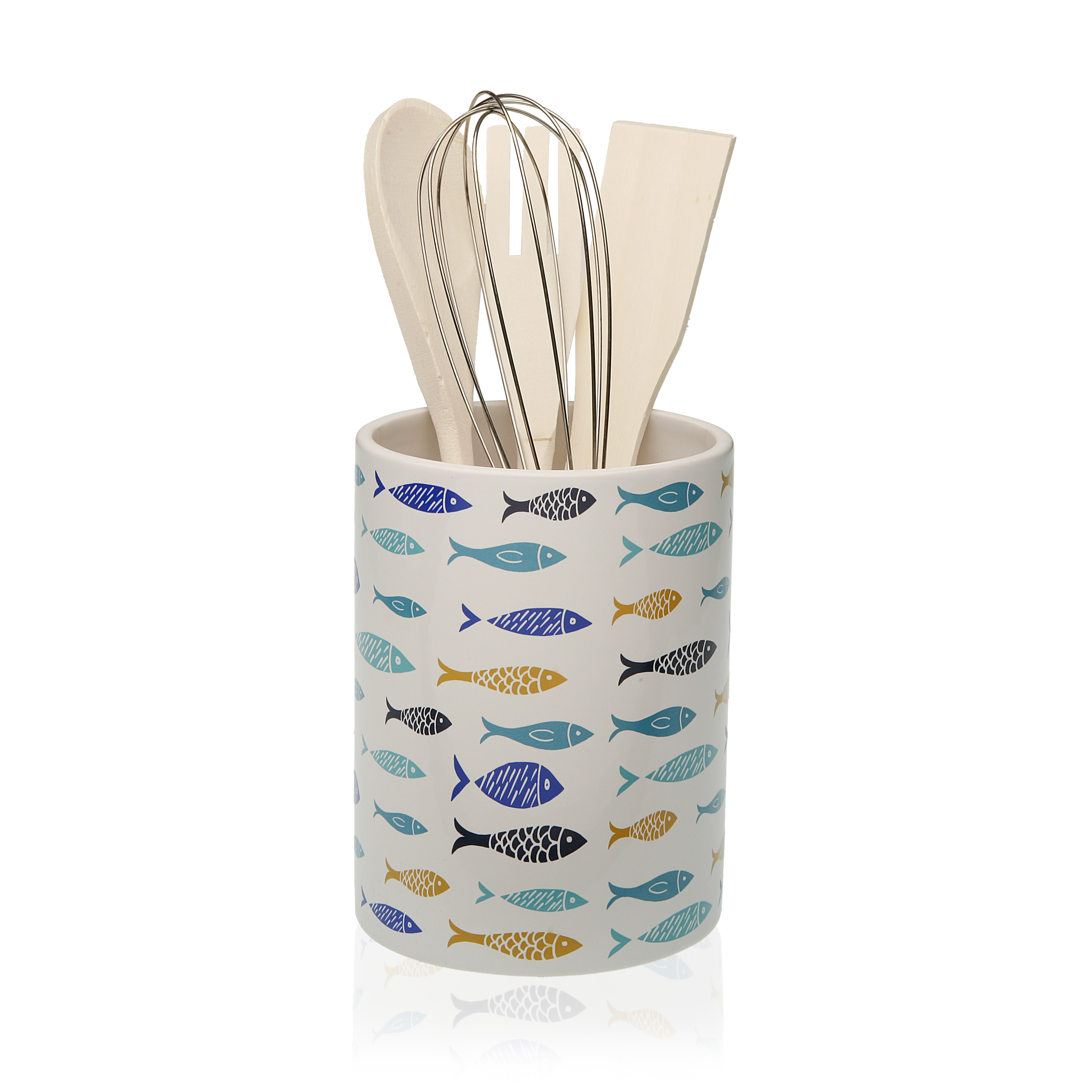 Mit diesem praktischen Keramikbecher habt ihr eure Kochutensilien stilvoll aufbewahrt und doch schnell griffbereit. Und eine Erstausstattung an praktischen Helferteilchen (siehe erstes Bild) gehört gleich mit zum Angebot.